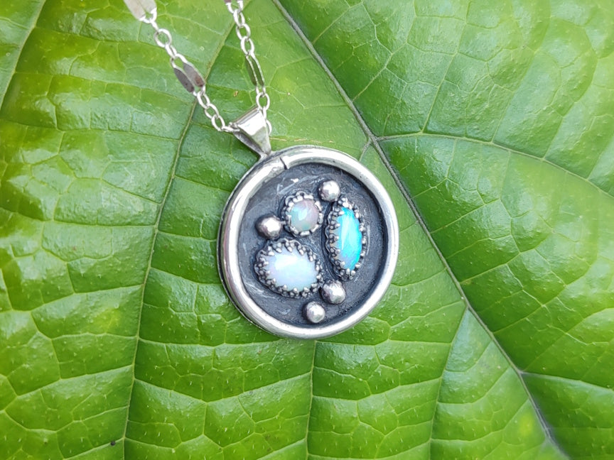 Handcrafted with love and care, this sterling silver shadowbox pendant displays a trio of different opals, each with its own special sparkle.