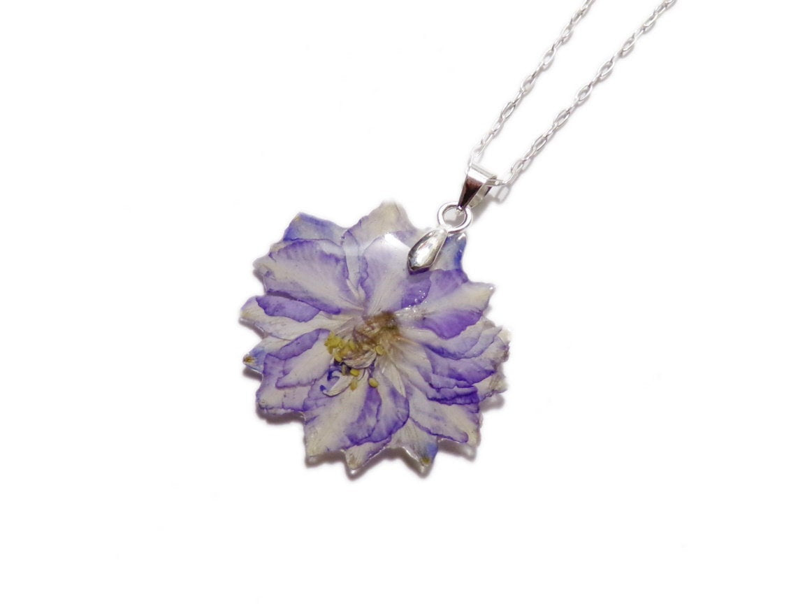 Pressed Larkspur Perwinkle and White Flower Necklace - Larkspur Delphinium - Real Flower - Nature Gift - Preserved Flower - ValenwoodVixen